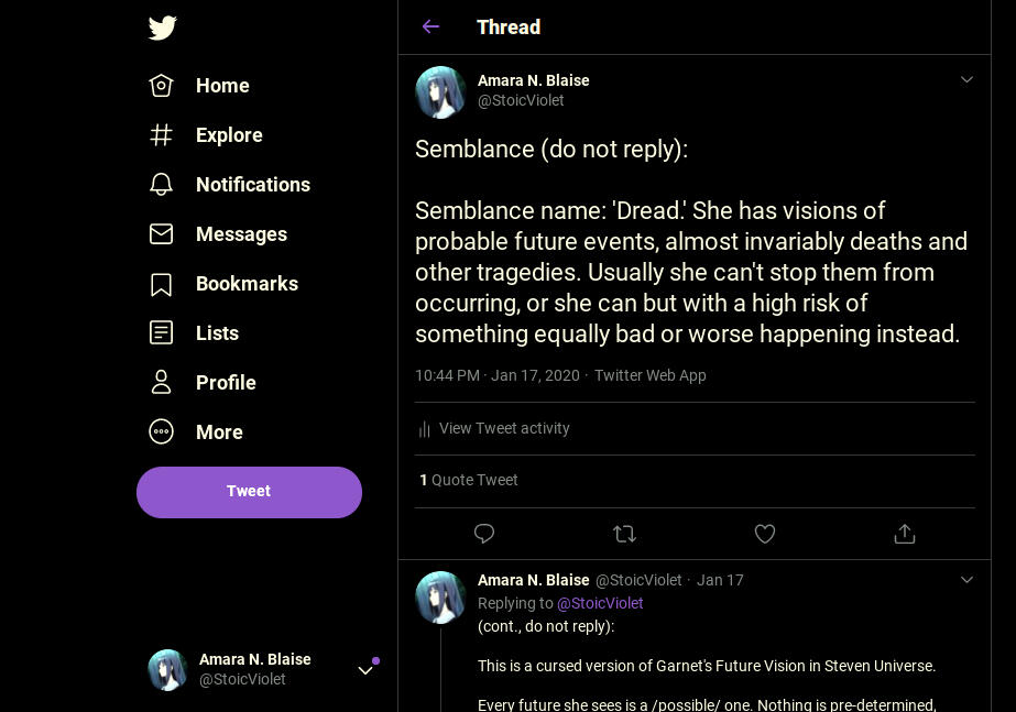 Semblance name: 'Dread.' She has visions of probable future events, almost invariably deaths and other tragedies. Usually she can't stop them from occurring, or she can but with a high risk of something equally bad or worse happening instead.This is like a cursed version of Garnet's Future Vision in Steven Universe. (But Amara does not see possible futures all the time.)Every future she sees is a possible one. Nothing is pre-determined, because fuck Calvinism.Amara has very little control of when she has future visions, or what they'll show. (She eventually learned to use her semblance on purpose, with great cost. It is rare that she will do so.)Amara once saw visions of her friend getting killed at a certain coffee shop the next day. So she begged her friend not to go. The friend laughed at her, saying she hadn't even planned to go there, but now she would just to prove that the vision was stupid and incorrect.Amara secretly followed her friend to the coffee shop hoping to protect her. The friend discovered her and they got into a huge fight. This attracted a swarm of Grimm, which killed the friend and almost everyone else there.She doesn't like talking about her semblance, especially with people she cares about.For many lives her future vision was a random occurrence over which she had little or no control. It still is, for the most part. But now, with great effort she can do it on purpose, if there is something she really needs to know about possible futures.Actively using her semblance like this feels like a bad drug trip, hurts her mentally and emotionally, leaves her physically exhausted, drains her aura to zero or near zero, and clouds her Soul Gem. It can also permanently warp her mind if she looks far enough, or often enough. She hates it, and it is very rare that she'll ever do it.It also drains her aura and clouds her Soul Gem when her semblance activates randomly, but not as much, depending on how bad the vision is and how long it lasts.